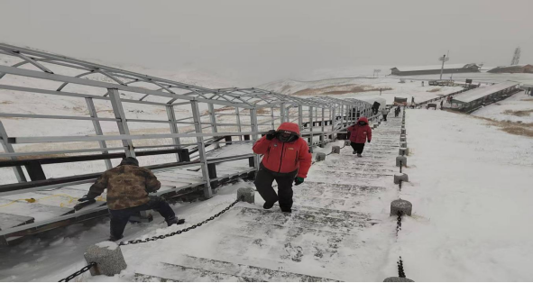 由于工期緊,任務(wù)重。11月中旬又緊急從西景區前勤、西集散及運營(yíng)部、南景區抽調人手支援,這些精兵強將在施工期間不僅要克服高強度勞作帶來(lái)的身體疲憊,還要適應主峰氣溫低的考驗。即便寒風(fēng)刺骨、凍得手指僵硬,他們也始終堅守崗位、毫不松懈。尤為動(dòng)人的是,他們以雪為令,即下即清,確保長(cháng)廊施工不受影響;他們心往一處想、勁往一處使,全力推進(jìn)工程進(jìn)度,只為能讓游客早日登臺階看天池。
